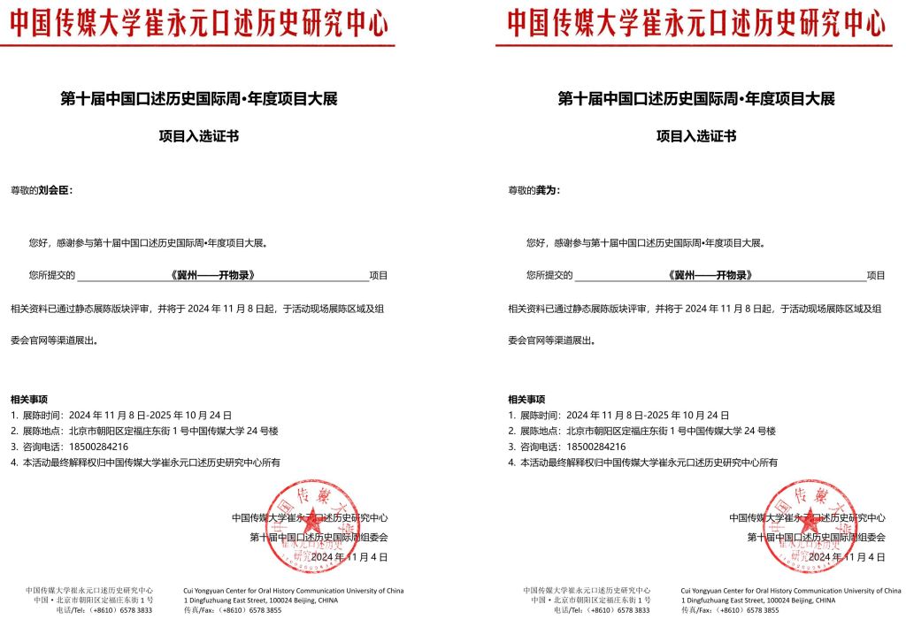 11月11日,由BEAT365影视艺术学院教师主导完成的《手机纪录片——冀州·开物录》口述历史项目成功入选由中国传媒大学发起并主办的第十届中国口述历史国际周。该项目由BEAT365影视艺术学院党委书记、院长王峰,影视与制作教研室主任刘会臣、外聘教授龚为共同完成。