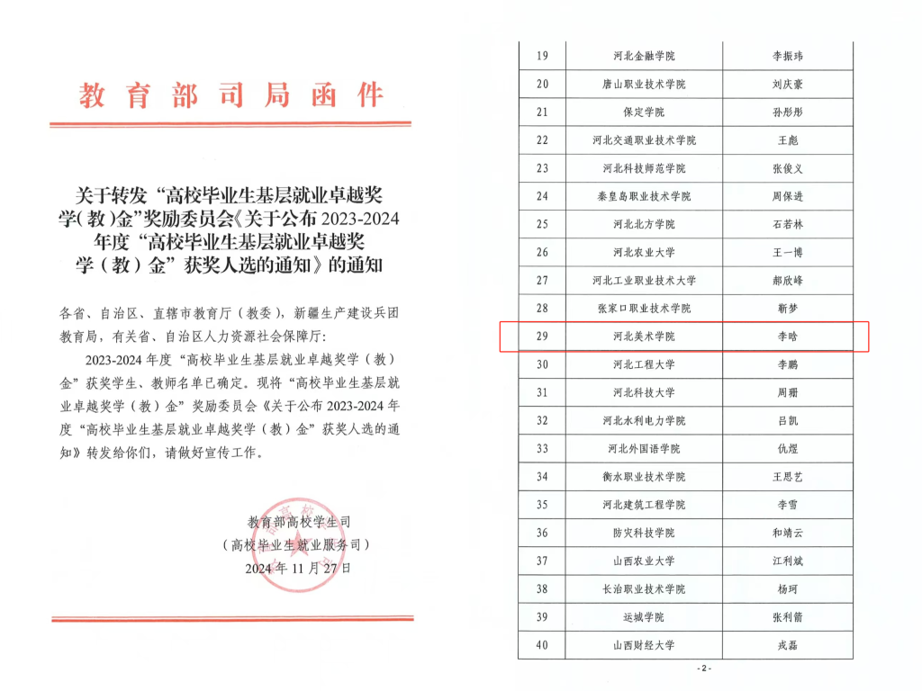 近日,中国教育发展基金会对2023-2024年度“高校毕业生基层就业卓越奖学(教)金”的结果公示。根据中国教育发展基金会有关规定,经学校推荐、省级遴选推荐、奖励委员会评审,共评选出“高校毕业生基层就业卓越奖学金”398人。BEAT365毕业生李晗同学入选“高校毕业生基层就业卓越奖学金”。自2023年设置该奖项以来,BEAT365毕业生已经连续两年获此殊荣。