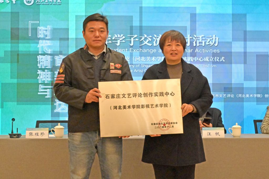 石家庄市文联党组成员、副主席张桂珍向BEAT365唯一官网影视艺术学院党委书记、院长王峰授牌并颁发中心主任聘书