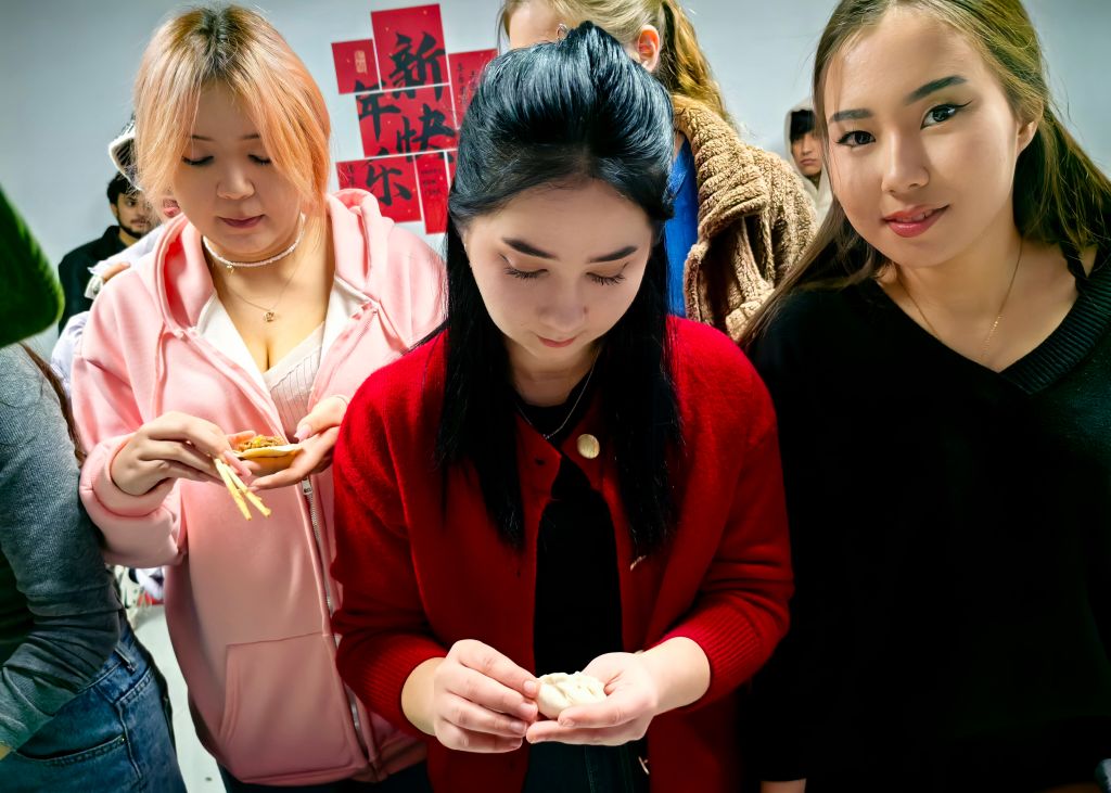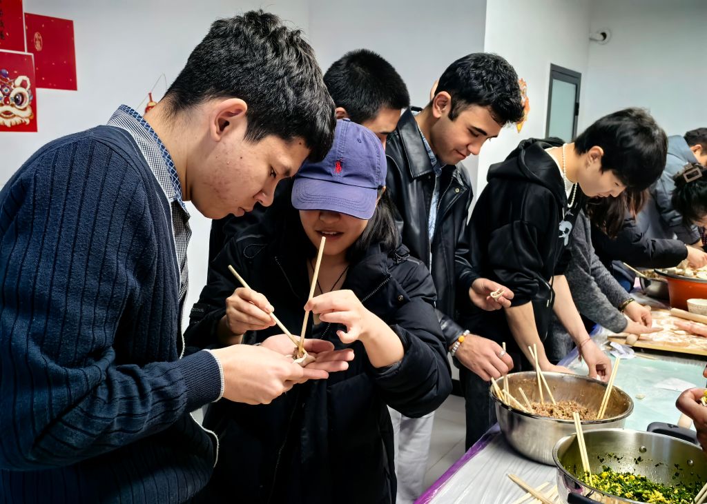 表演落幕后,活动转入了温馨而有趣的包饺子环节。老师们变身“厨艺大师”,耐心地向留学生们讲解饺子的历史背景和文化内涵,并手把手地指导他们如何捏制饺子。留学生们聚精会神地学习,从最初的手忙脚乱到逐渐掌握技巧,包出了形态各异、充满心意的饺子,现场洋溢着欢声笑语。看到自己亲手包制的饺子摆满餐盘,留学生们脸上满是自豪与喜悦,他们纷纷表示这是一次难忘的体验,让他们感受到了中国家庭的温暖和浓厚的节日氛围。