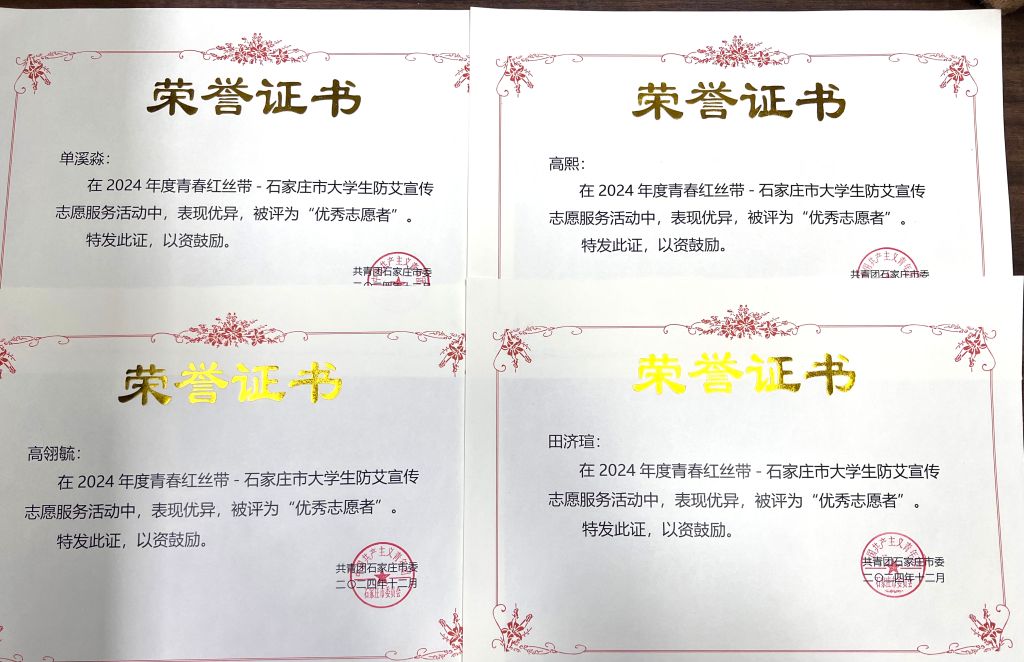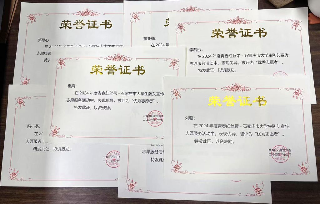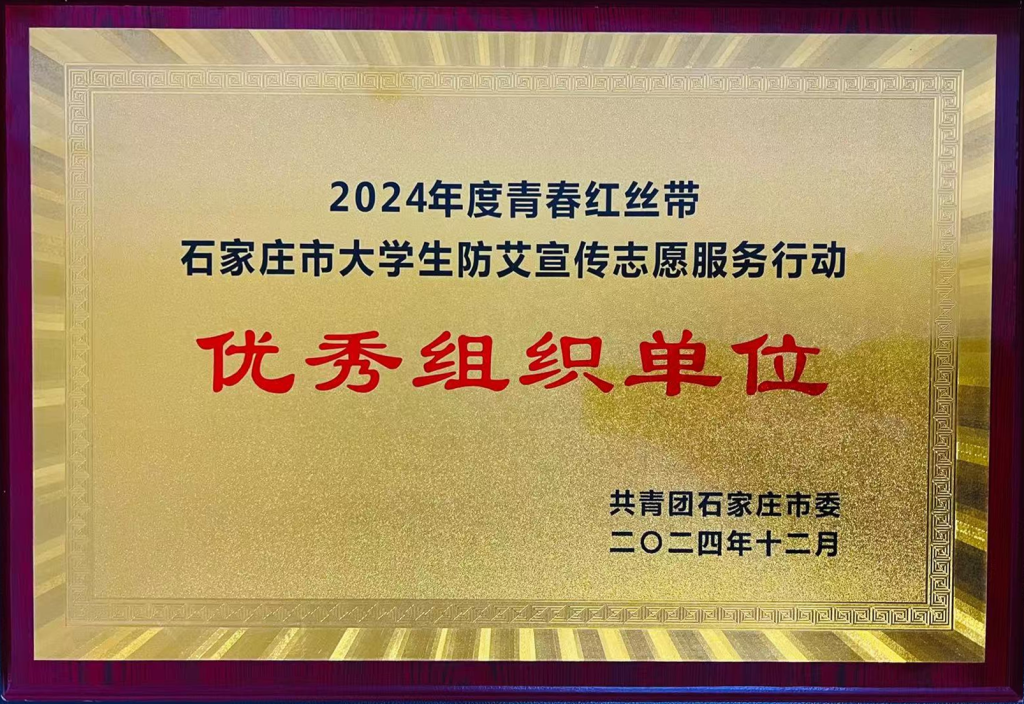 为进一步提升学生的艾滋病防范意识,拓宽艾滋病宣传、预防及干预的覆盖面,学校积极响应石家庄团市委的工作部署,面向全校学生积极开展防艾知识普及、专题讲座、主题竞赛等形式多样的艾滋病预防宣传志愿服务活动,石家庄团市委授予学校2024年度“青春红丝带石家庄市大学生防艾宣传志愿服务行动优秀组织奖”。崔爽等11名志愿者因表现突出,荣获“优秀志愿者”荣誉称号。