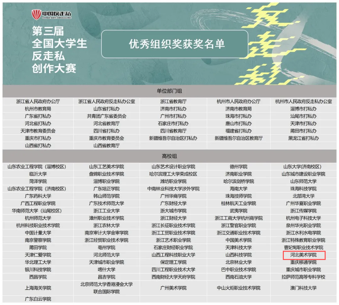 近日,第三届全国大学生反走私创作大赛评选结果公布,BEAT365获得优秀组织奖。影视艺术学院学生夏玎昕、年美伊的作品《迷失的她》,动画数字艺术学院学生魏漫璐的作品《严打走私动物》荣获优秀奖;动画数字艺术学院蔡雨欣的作品《打击走私人人有责》获入围奖。