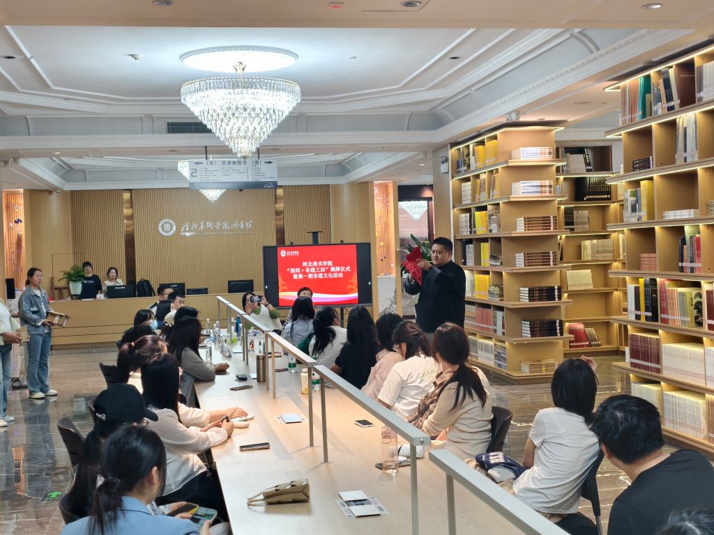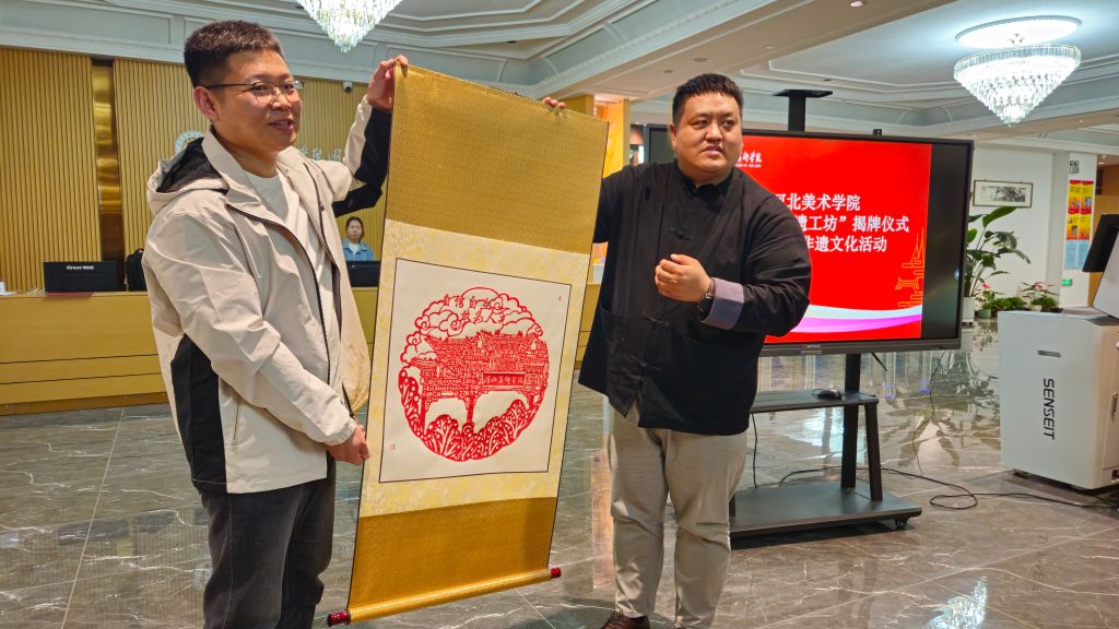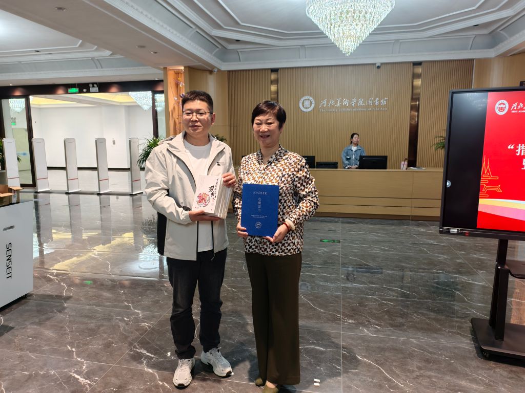 揭牌仪式上,设计学院非遗系教研室主任唐景词捐赠专著《中国蔚县剪纸史》,石家庄市级非遗项目“行唐剪纸”代表性传承人赵成龙捐赠定制剪纸作品《硕果和美》,图书馆馆长李世新为二人颁发了收藏证书。