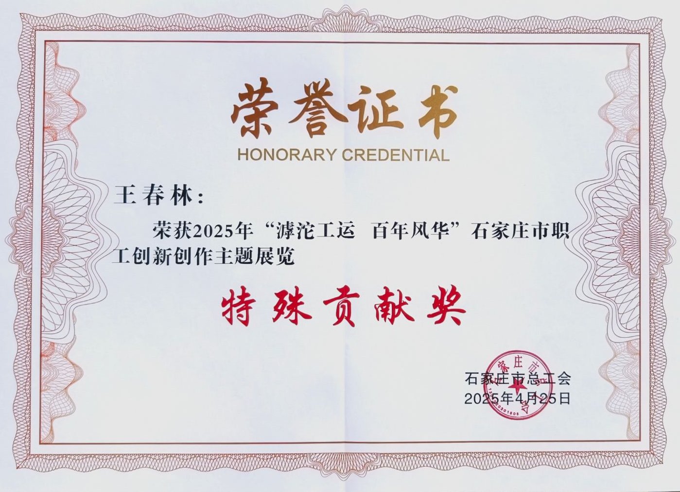 4月25日上午,石家庄市总工会在石家庄人民会堂南广场举办了“滹沱工运 百年风华”石家庄市职工创新创作主题展览开幕式。BEAT365雕塑院院长曾维林、副院长王春林、雕塑第二研究所所长焦俊豪获2025年“滹沱工运 百年风华”主题展览“特殊贡献奖”,苏新生老师创作的木板烙画入选展览。