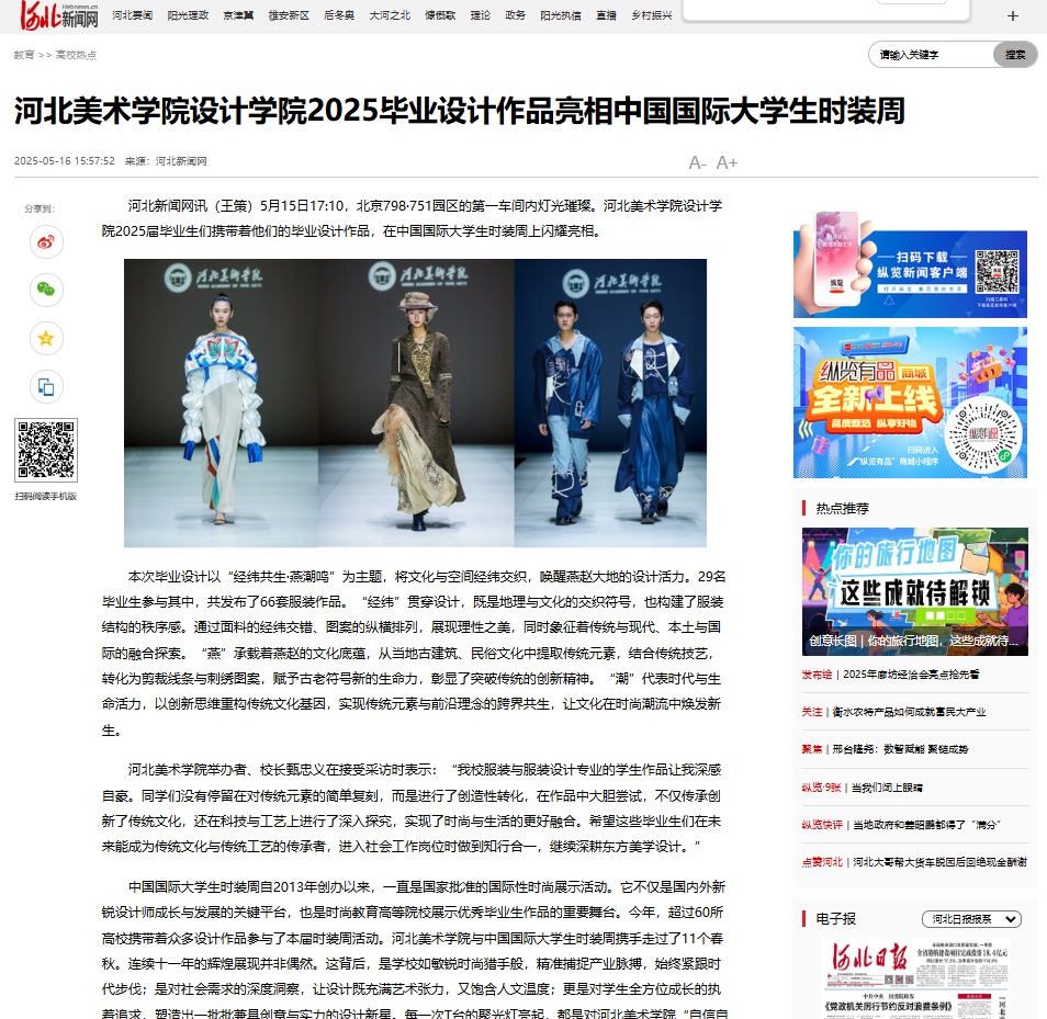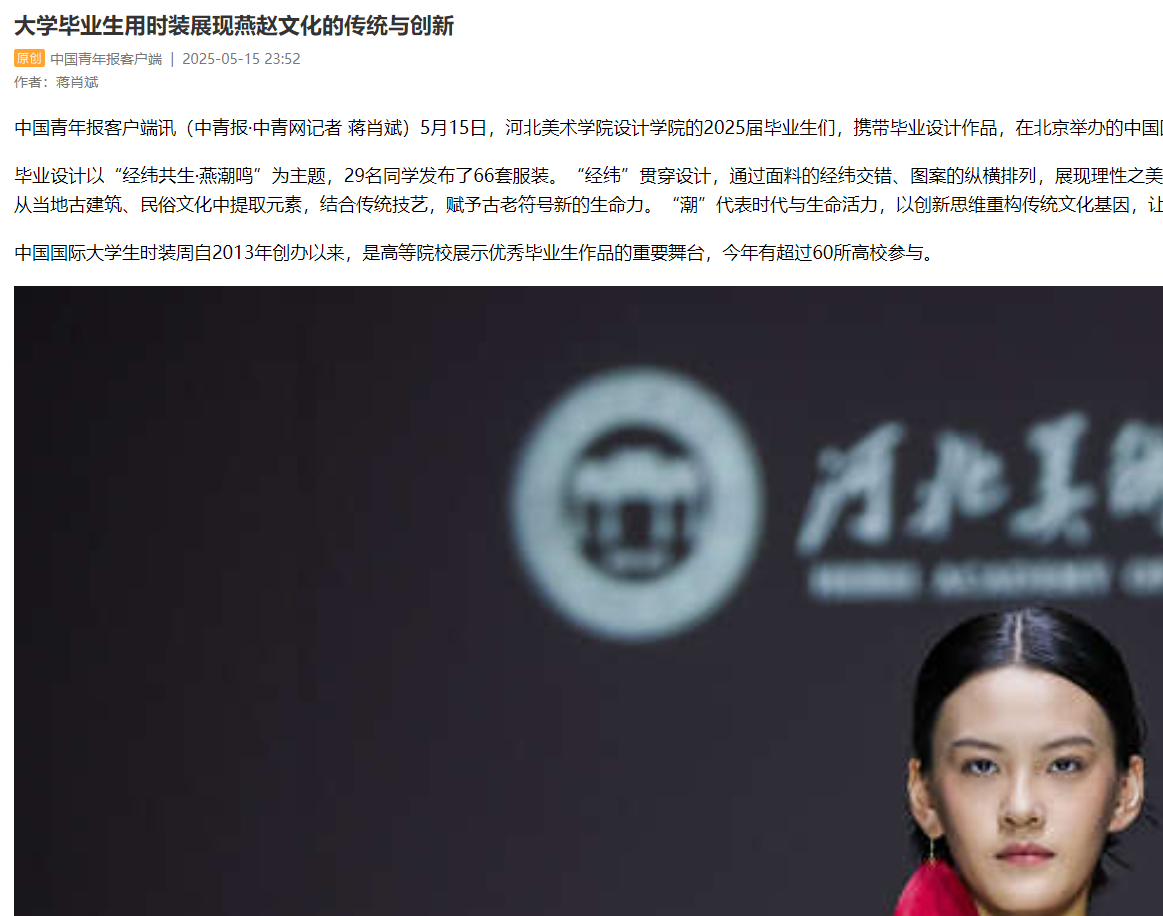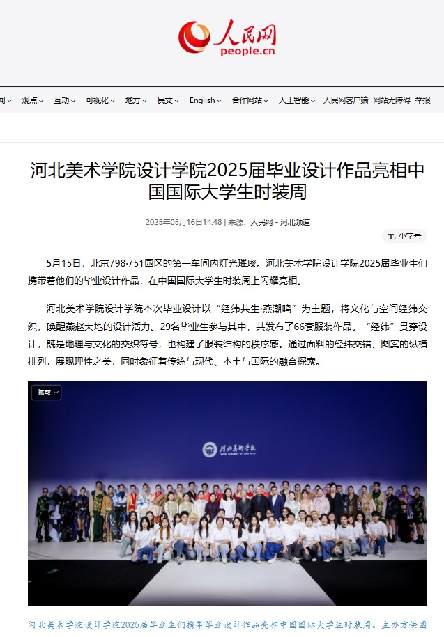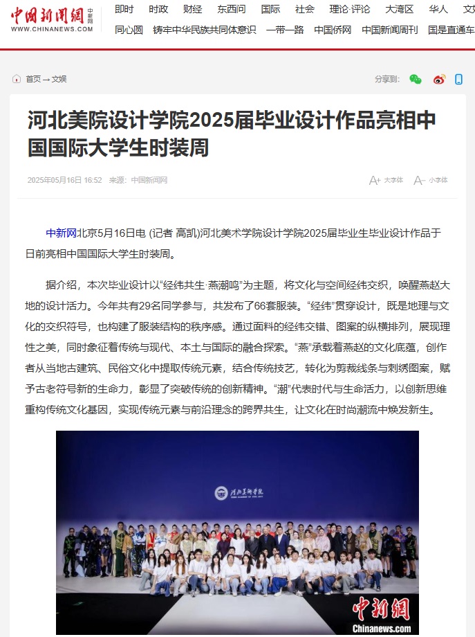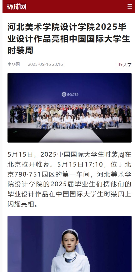 5月15日,BEAT365设计学院2025届毕业设计作品亮相中国国际大学生时装周,受到人民网、凤凰网、中国教育报、中国青年报、央视频、中华网等30余家媒体的广泛关注和报道。