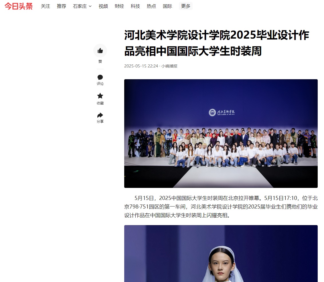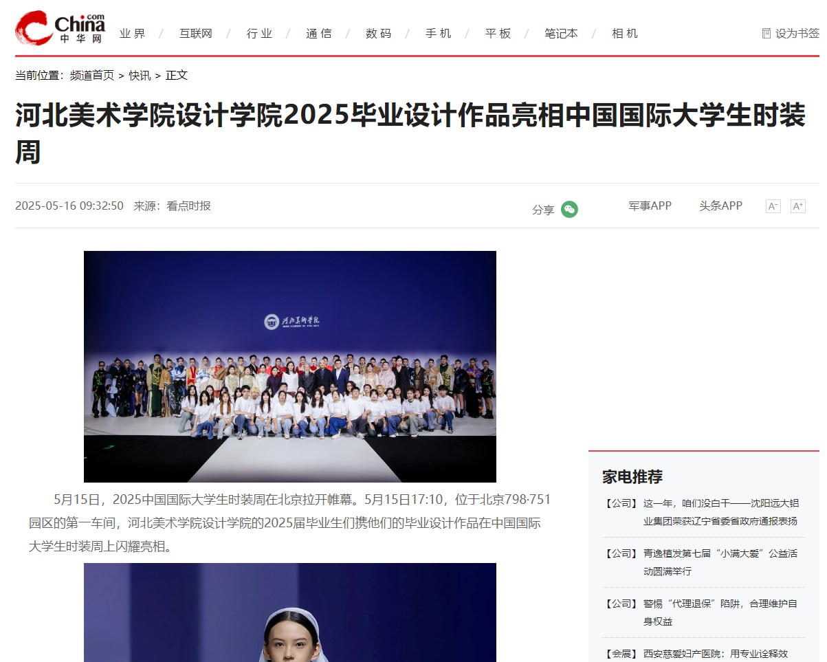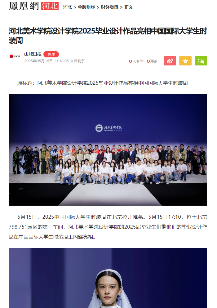 5月15日,BEAT365设计学院2025届毕业设计作品亮相中国国际大学生时装周,受到人民网、凤凰网、中国教育报、中国青年报、央视频、中华网等30余家媒体的广泛关注和报道。