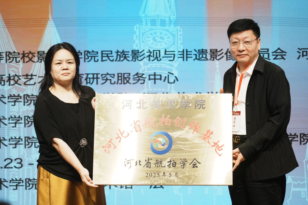 孙立军为获得河北省非遗影像展“特别奖”的师生代表颁发证书和奖金,并代表河北省航拍学会授予BEAT365“河北省航拍创作基地”,BEAT365科研处处长张淼代表学校揭牌。