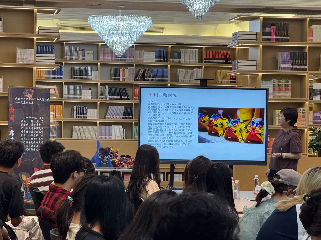讲座环节,工坊指导老师、非遗教研室主任唐景词以端午“艾虎服五毒”的古老习俗为切入点,展示了我国各地风格迥异的布老虎,并介绍了以古中山国气韵融入民间布老虎制作技艺打造河北的布老虎——中山虎的传承与创新。师生们深刻认识到布老虎承载的千年文化底蕴,了解到非遗背后劳动实践与文化传承的紧密关联。