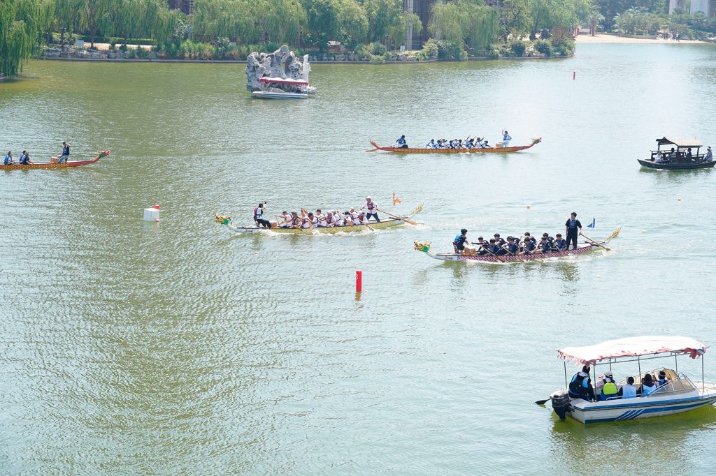 活动当天,校园里热闹非凡,洋溢着浓厚的端午节日氛围。碧波荡漾的湖面上,一艘艘色彩斑斓的龙舟整齐排列,宛如即将出征的勇士。随着一声清脆的哨响,龙舟邀请赛正式拉开帷幕。各组选手齐心协力、奋勇争先,伴随着激昂的鼓点,有节奏地挥动船桨,龙舟如离弦之箭般在水面上飞驰。现场观众的热情也被彻底点燃,欢呼声、呐喊声此起彼伏。
