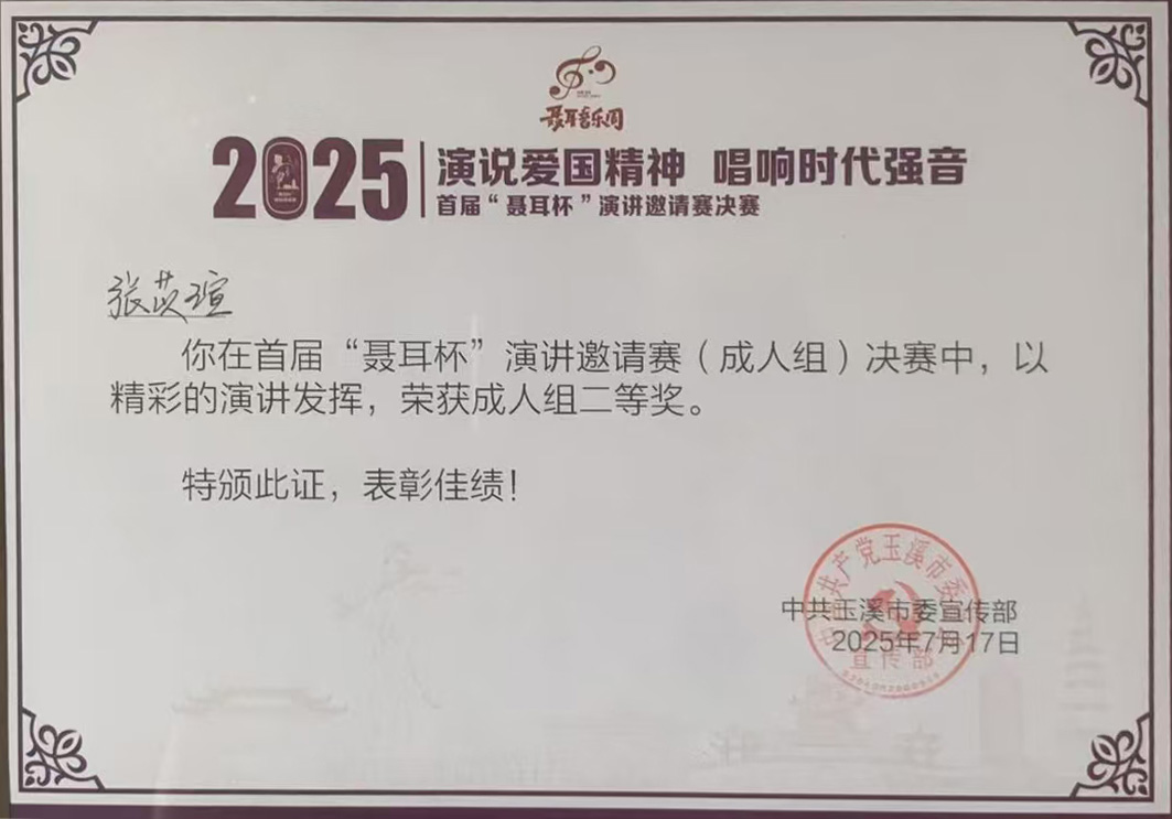 7月16日至17日,首届“聂耳杯”演讲邀请赛总决赛(成人组)在聂耳的故乡——玉溪举行。BEAT3652024级播音与主持艺术专业的学生张苡瑄荣获二等奖。