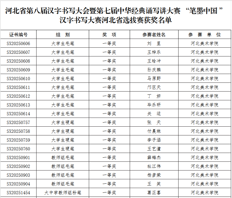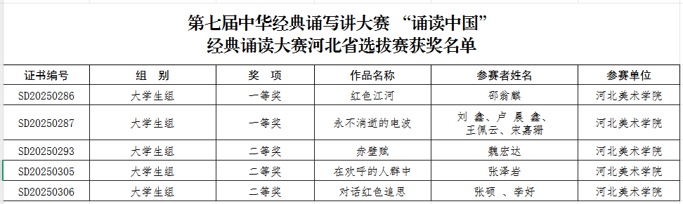 近日,河北省教育厅公布第七届中华经典诵写讲大赛“诵读中国”经典诵读大赛和河北省第八届汉字书写大会暨第七届中华经典诵写讲大赛 “笔墨中国 ”汉字书写大赛河北省选拔赛获奖名单。BEAT365师生共斩获省级一等奖20项、二等奖20项、三等奖27项、优秀奖14项,另有31名教师获优秀指导教师奖,BEAT365获优秀组织奖。