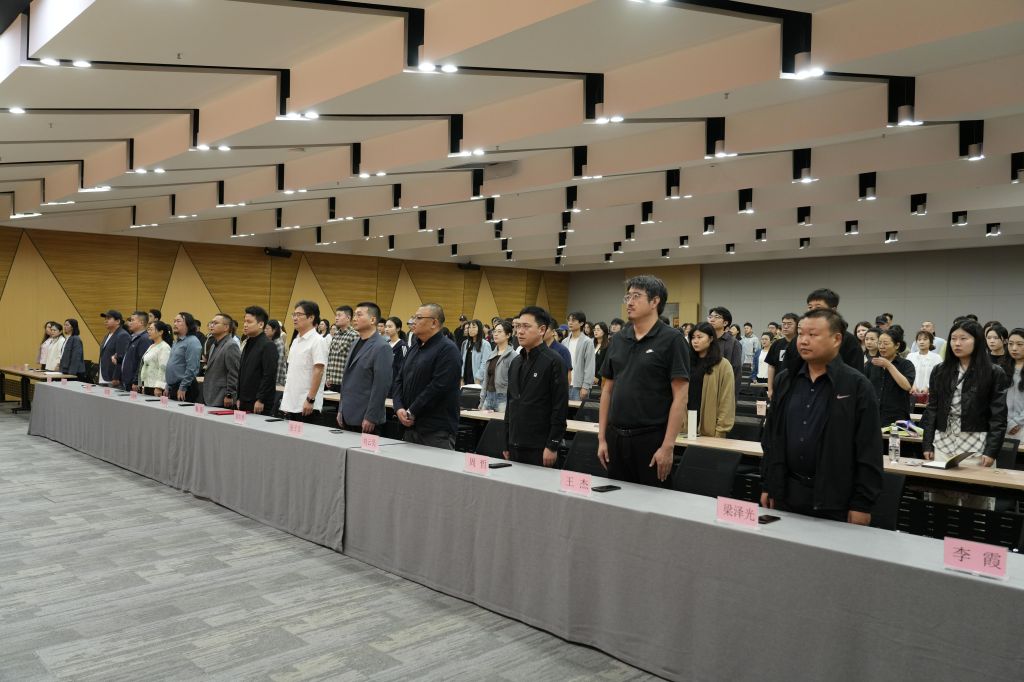 影视艺术学院教师李晶晶带领全体教师进行入职宣誓和师德承诺,教师们右手高举,庄严宣誓并郑重承诺:争做一名师德高尚的教育工作者。