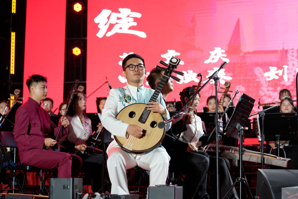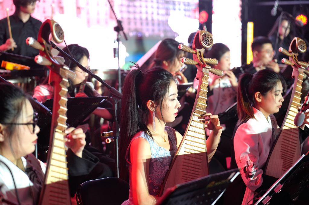 9月24日晚,民族管弦乐专场音乐会以《金蛇狂舞》激昂开场,通过锣鼓与旋律的交织,再现抗战时期中华民族不屈不挠的斗争精神。随后,《印象国乐》以笛箫、弦乐与打击乐的对话,勾勒出从雪域高原到江南水乡的壮美画卷;《云想花想》则借琵琶珠落玉盘般的音色,演绎李白笔下“云想衣裳花想容”的诗意。