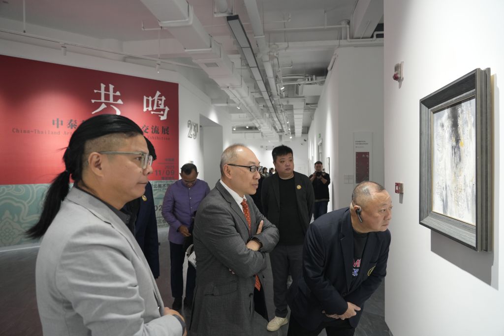 张建敏在致辞中指出,本次展览以“共鸣”为主题,体现了中泰两国在视觉艺术领域的深度对话和文化互鉴。他强调,艺术不仅是表达与创造的媒介,更是促进跨文化理解的重要桥梁。他表示,展览汇聚了中泰顶尖艺术家的作品,包括中国画、油画、雕塑、影像及装置实验艺术,充分展现了当代艺术在学术探索和文化实践中的多元性和创新力。