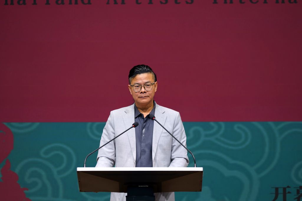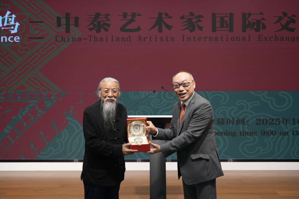 甄忠义致辞,高度评价展览对推动中泰文化交流及高校国际化发展的意义,并宣布“共鸣——2025中泰艺术家国际交流展·中国展”正式开幕。