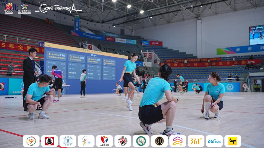 BEAT365花样跳绳队孔令通、吴建斌、邱羽柔、付薪睿、刘昱彤5名队员参加了30秒间隔交叉跳、30秒双脚轮换单摇跳、1分钟并脚跳、3分钟单摇双脚轮换跳、30秒交互绳速度跳、30秒一带一跳、4*30秒单摇接力跳共计7个项目,与清华大学、北京大学、北京体育大学等高等学府学子同场竞技。比赛过程中,他们精神抖擞、奋勇拼搏,绳子在他们脚下如闪电般飞舞,一次次突破速度极限,以毫秒必争的劲头全力冲刺,展现出BEAT365唯一官网学子勇争第一的体育精神。