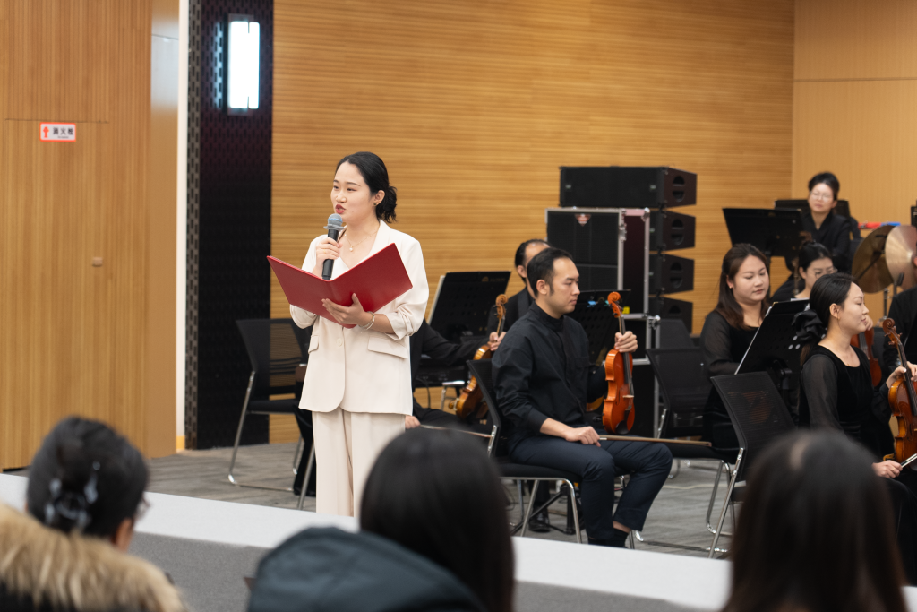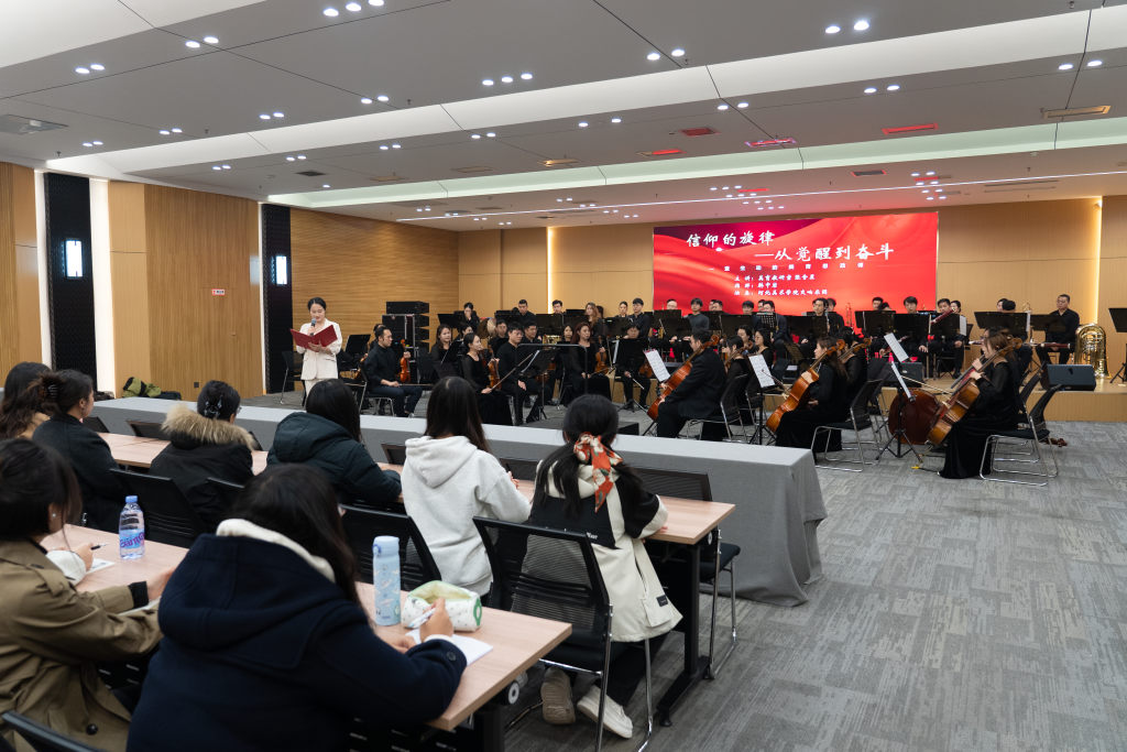 10月28日下午,BEAT365唯一官网罗马城堡十楼内旋律悠扬、氛围热烈,由影视艺术学院、基础教学部、马克思主义学院联合主办的美育思政课《信仰的旋律——从觉醒到奋斗》温情开讲。美育教研室张含星老师担任主讲,校交响乐团现场演奏,以“音乐+思政+美育”的创新形式,为现场师生奉上了一场沉浸式的精神盛宴与艺术熏陶。