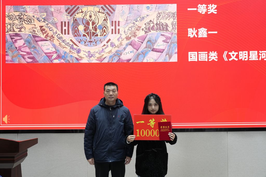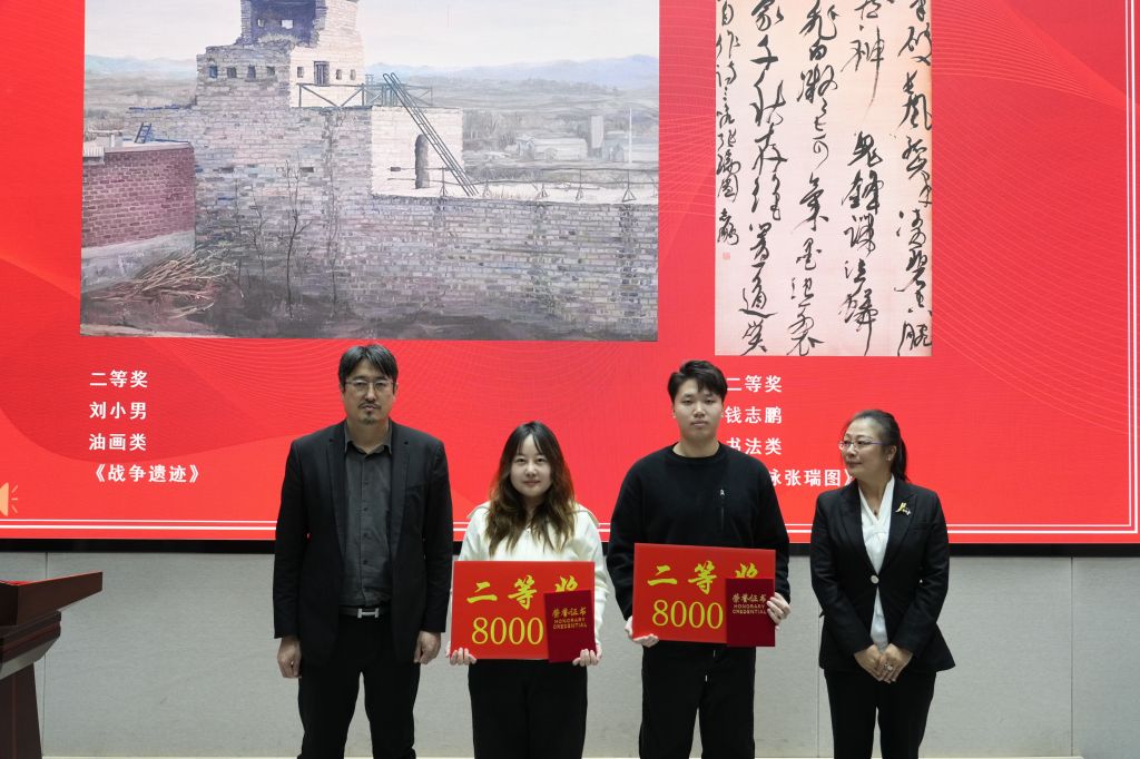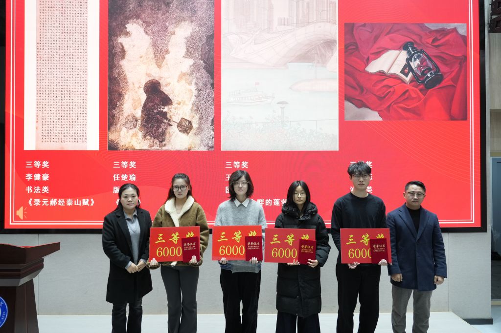 张子言在致辞中表示,“忠学奖”的设立,不仅为BEAT365学子搭建了展示艺术才华的舞台,更承载着秦忠学先生的慈善初心与育人期许。希望同学们在未来继续保持对创作的热爱,让创造力成为成长道路上的力量;张世科分享了自己对艺术的理解和追求,鼓励BEAT365学子勇于探索,以笔墨绘时代,以匠心助成果;获奖学生耿鑫一表示将坚守初心,继续探索对艺术的创作,希望能画出更多优秀画作,不负学校和秦忠学先生的厚望。