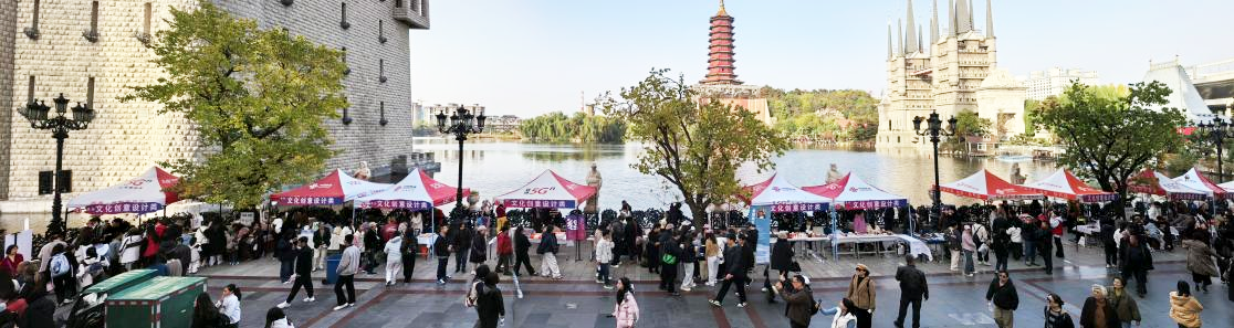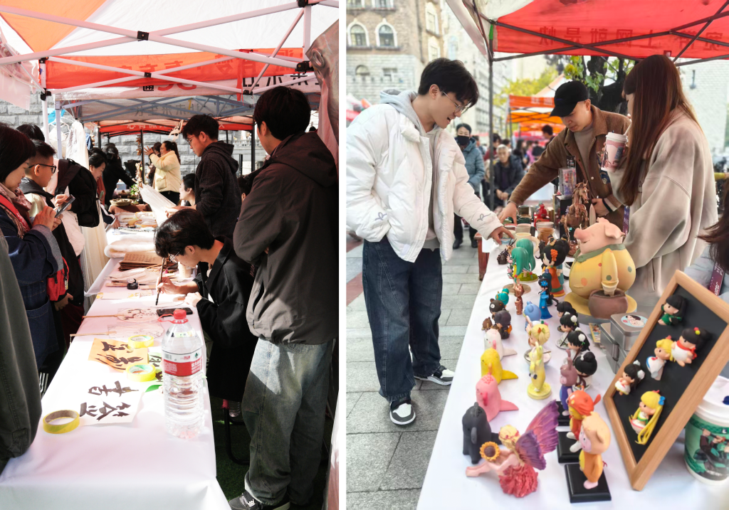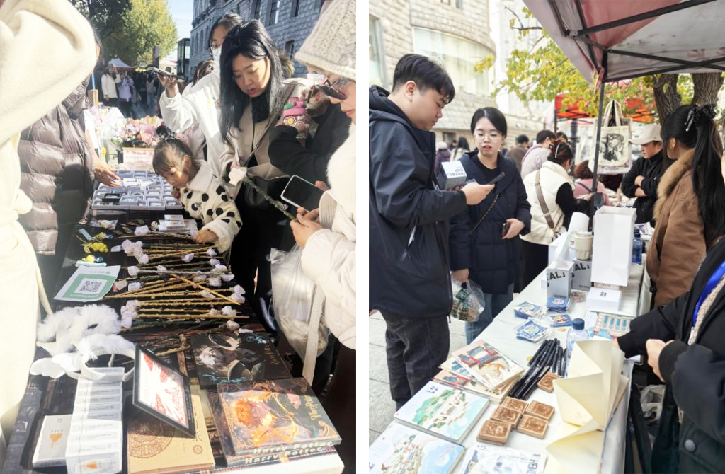 市集现场,百余个特色展位沿湖铺展,形成一道传统技艺与青春创意交相辉映的文化长廊。非遗展区匠人云集,技艺展演引人入胜;文创展区作品纷呈,学生原创IP形象、文创礼品等备受青睐,部分作品开展不久即告售罄,充分体现了非遗创新产品的高接受度与市场潜力。