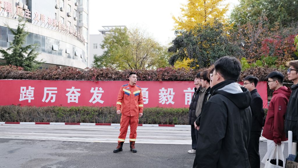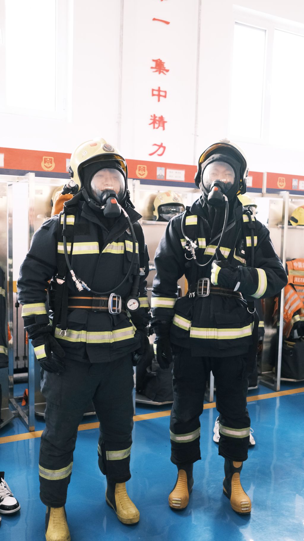 装备体验区点燃了大家的热情。“这个破拆钳看着不沉,握在手里才知道有多费劲!”一名男生试着提起液压破拆工具,脸都憋红了,消防员笑着上前指导:“它能快速破拆障碍物,关键时刻能救命,平时多练才能熟练使用。”大家对防毒面罩充满好奇,在消防员的帮助下戴好面罩,瞬间感觉呼吸困难,“戴着这个还要冲进火场,真的太不容易了”。穿上近30斤的消防战斗服时,大家刚站一会儿就浑身冒汗,有人打趣说“像裹了一层棉被”,可看着镜子里一身“火焰蓝”的自己,又忍不住挺直了腰板——这沉甸甸的重量,正是“赴汤蹈火”的责任与担当。登上高空作业车缓缓升起,辖区的街道、楼宇尽收眼底,消防员指着远处介绍:“现在我们不仅要灭火,还要应对地震、洪水等各类灾害,‘全灾种、大应急’就是要守护好每一寸土地。”