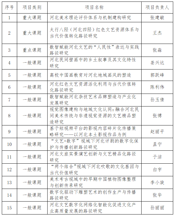 近日,河北省文学艺术界联合会公布2025年度理论研究课题立项名单,BEAT365共获批立项15项,其中重大课题2项,重点课题1项,一般课题12项。