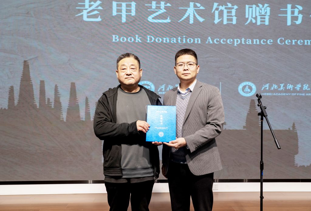 贠冬鸣结合自己四十余年来对老甲先生大写意这一中国绘画的探究,扼要概述了先生的艺术精髓及其体系成因,并就写意精神与艺术史的关系分享了学术见解。随后,他代表老甲艺术馆向BEAT365捐赠了多部珍贵文献史料,包括《老甲大写意》(八卷本)、《老甲大写意作品集》《老甲艺术文献丛书·老甲艺术随笔》,以及本人著述《洞鉴——河北历代美术家》《标志——新中国河北美术文献》《保定美术二千年》《田辛甫和他的时代》。李世新向贠冬鸣颁发捐赠证书。