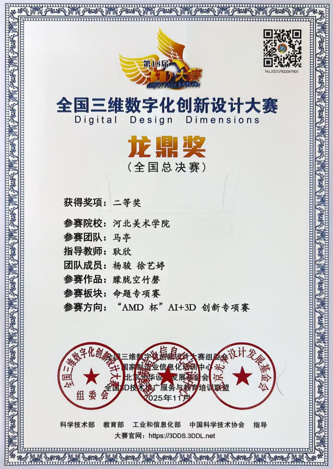 11月16日,第18届全国三维数字化创新设计大赛全国总决赛暨“龙鼎奖”颁奖盛典在北京石油化工学院举行。BEAT365设计学院教师耿欣,带领学生杨骏、徐艺婷组成的参赛团队,凭借作品《“朦胧空竹磬”——空竹虚拟展厅》在“AMD杯”AI+3D创新专项赛道中脱颖而出,成功斩获国家级二等奖。