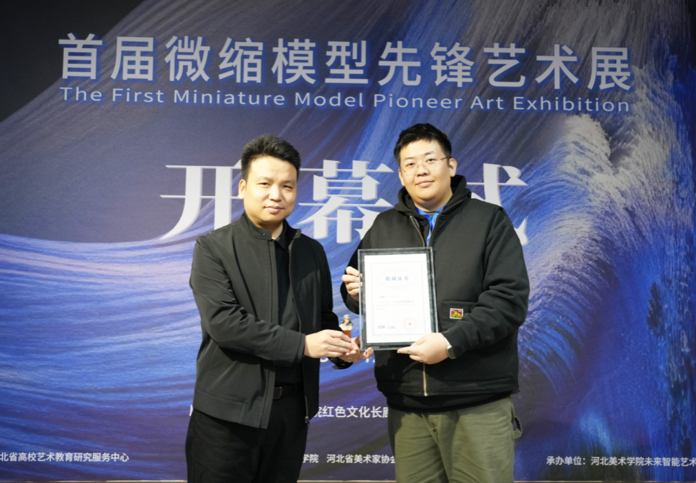 26位微缩模型艺术家向学校捐赠《摩登红军战士》《超精细人物头雕》等30件作品,甄墨代表学校接受捐赠,校领导为特邀艺术家颁发收藏证书。