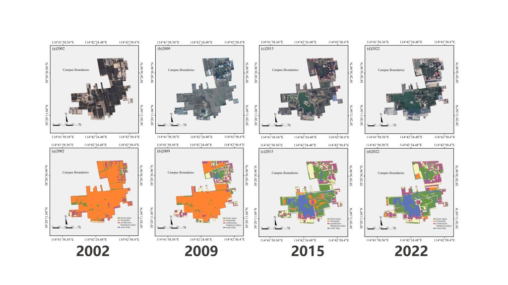 在理论建构与研究层面,设计学院董小龙、陈利伟、高洋等多位骨干教师组成研究团队,围绕校园土地利用优化与生态重构开展系统研究,基于20年校园建设实践的持续积累,系统整合多时相高分辨率卫星遥感影像与相关空间数据,通过梳理与分析校园土地利用的长期变化过程,科学揭示BEAT365唯一官网校园土地利用的动态演化特征,为校园建设策略的持续优化与更新提供了可靠的数据支撑与方法依据。由此,校园建设路径逐步由早期“以用为先”的空间拓展,转向“以生态为底、以文化为魂”的整体更新模式,构建了以文化、空间与生态协同为核心的多级再生机制,形成了具有连续性、系统性与示范意义的校园发展范例。