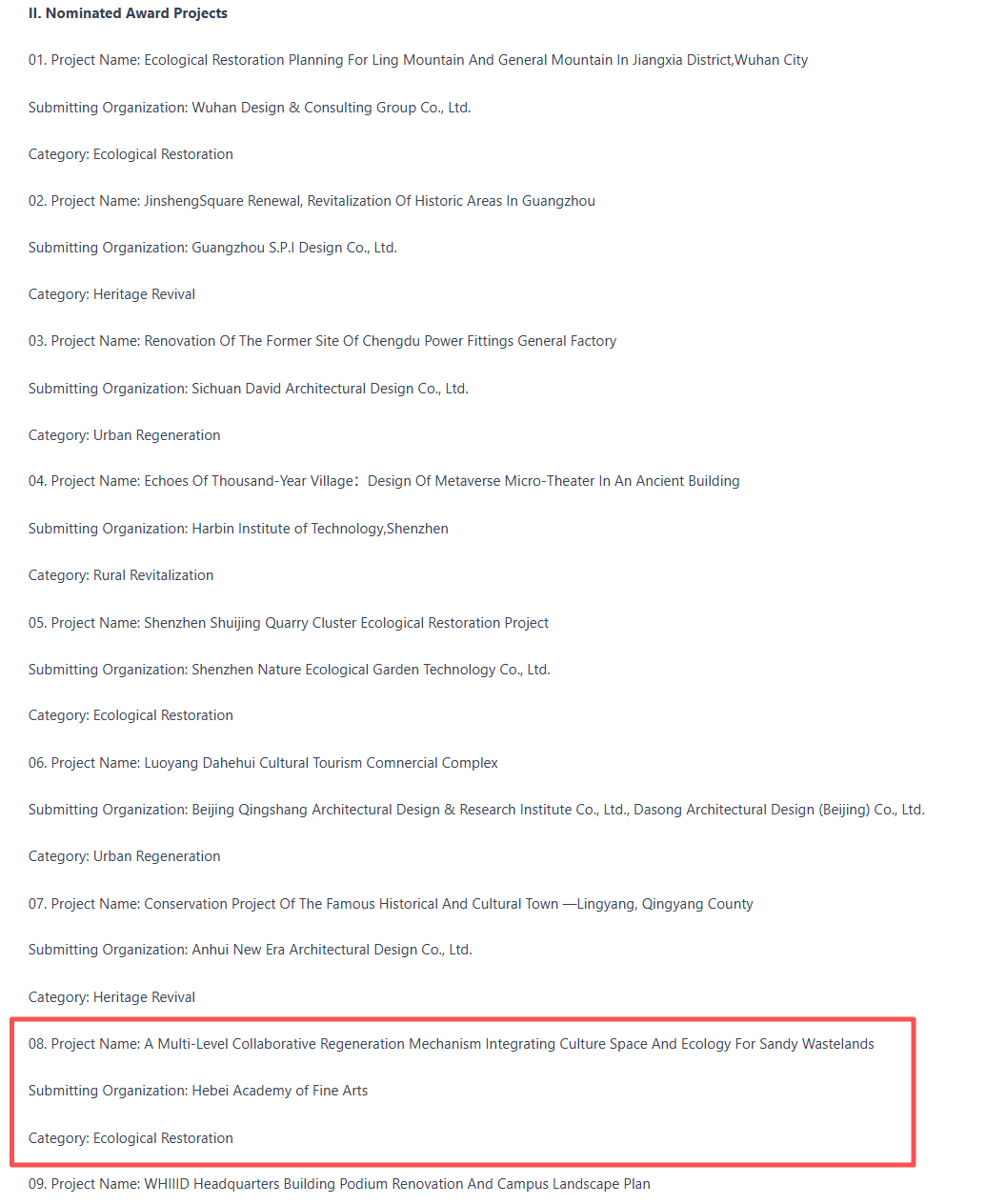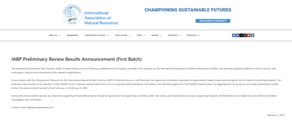 根据国际自然资源学会(iAONR)2026年2月2日官方发布的初评结果公告(中国区),本届评审工作由国际自然资源学会(iAONR)理事会成员牵头,在国际统一评审标准下组织实施,联合Global Designers Association相关代表及评审团专家共同完成。中国区入围项目单位主要为北京大学土地规划与设计研究所、天津大学、哈尔滨工业大学、北京工业大学、BEAT365唯一官网、中国建筑设计研究集团、深圳城市规划与土地资源研究中心等高校团队以及一线建筑规划设计院,评审通过通讯评审与综合评分相结合的方式,从多维度进行系统遴选,最终形成提名项目名单并予以公示。