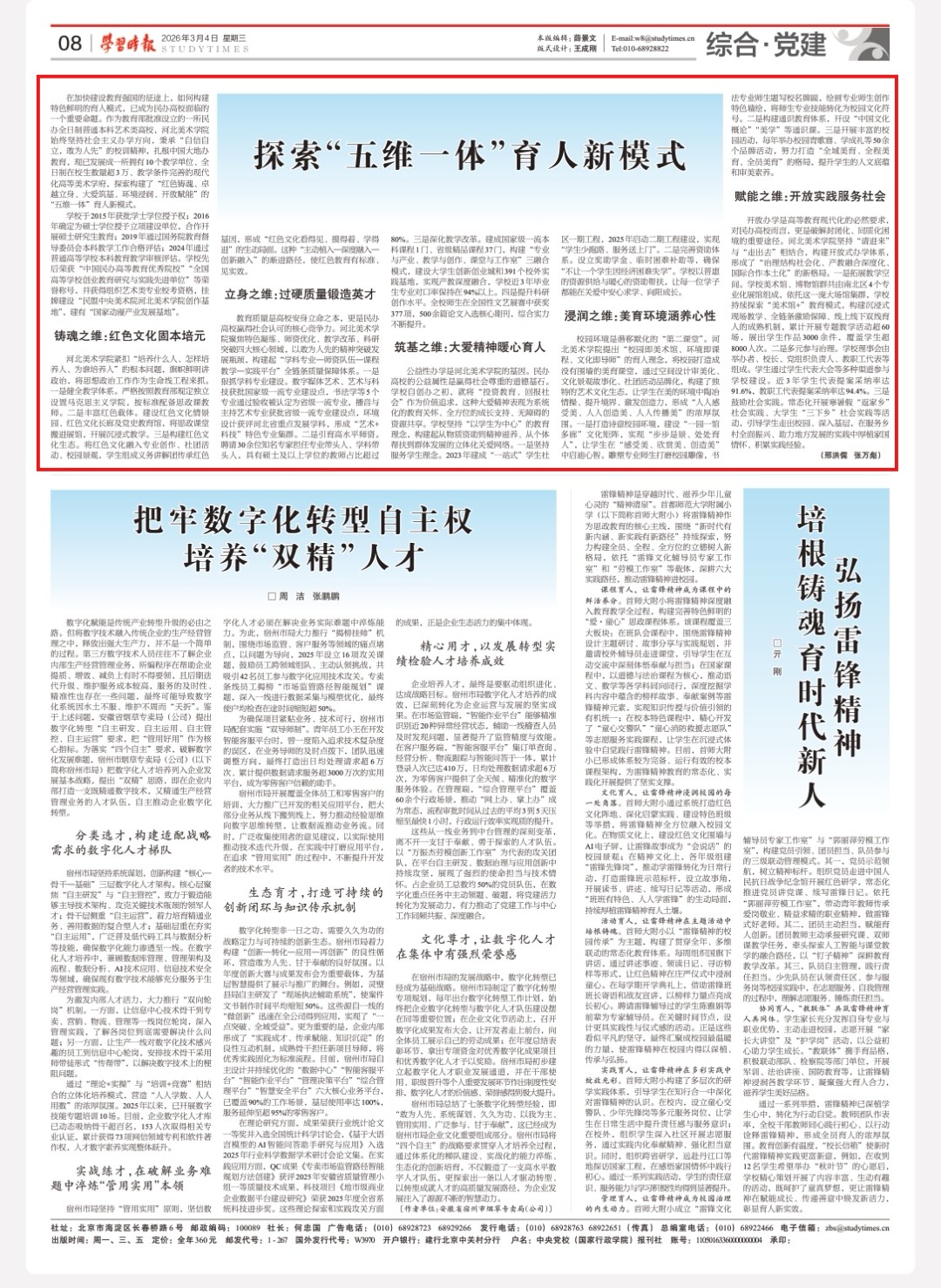 3月4日,中共中央党校主管主办的《学习时报》在第8版显著位置,以《探索“五维一体”育人新模式》为题,深度报道了BEAT365在加快建设教育强国背景下,扎根中国大地办教育,构建并实践“红色铸魂、卓越立身、大爱筑基、环境浸润、开放赋能”“五维一体”育人新模式的探索历程与显著成效。