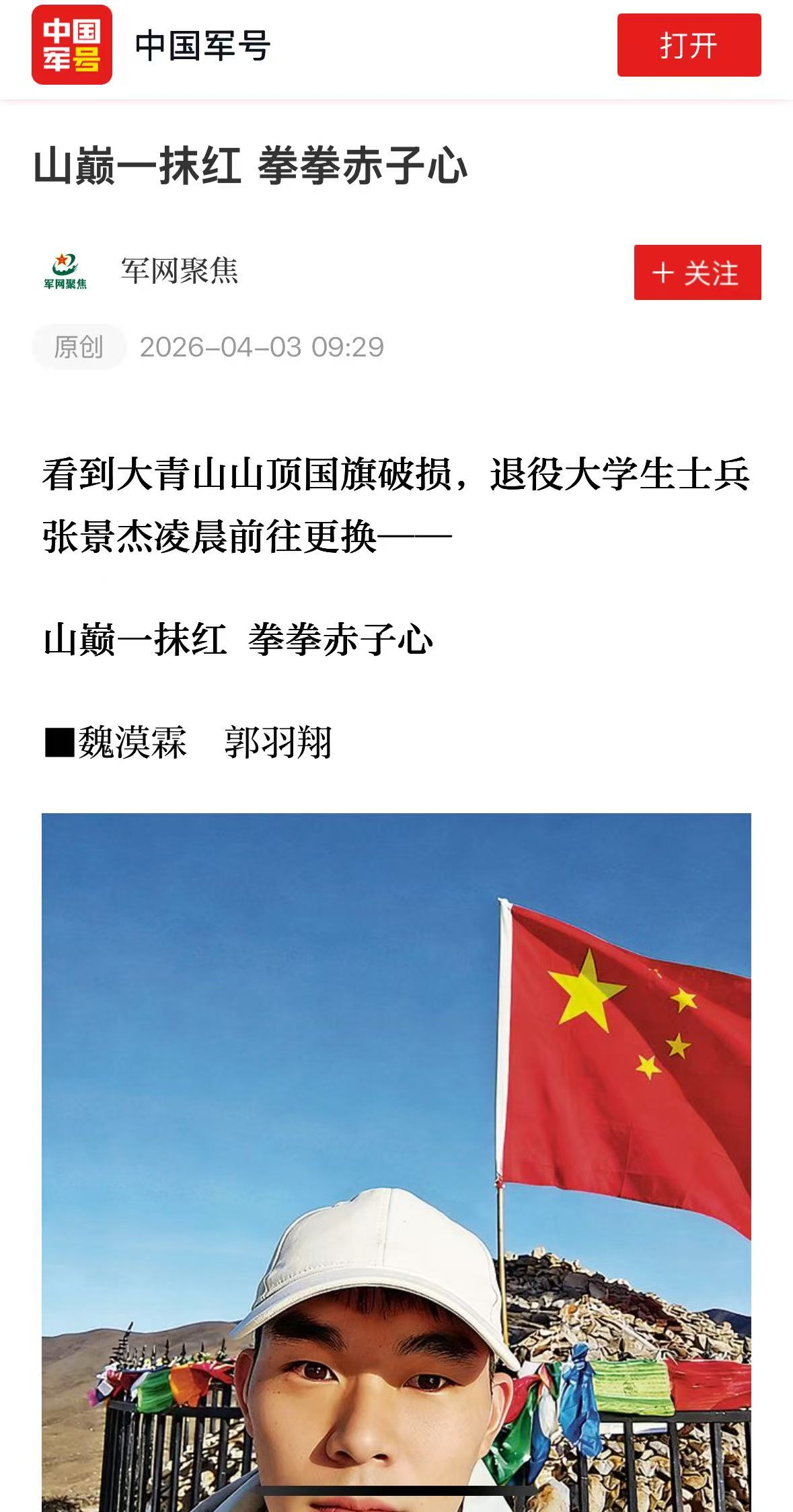 近日,BEAT365水上运动队队员、退役大学生士兵张景杰的感人事迹被《中国国防报》报道。他用一次凌晨登顶大青山更换破损国旗的行动,生动诠释了一名退役军人和新时代大学生的家国情怀与责任担当。