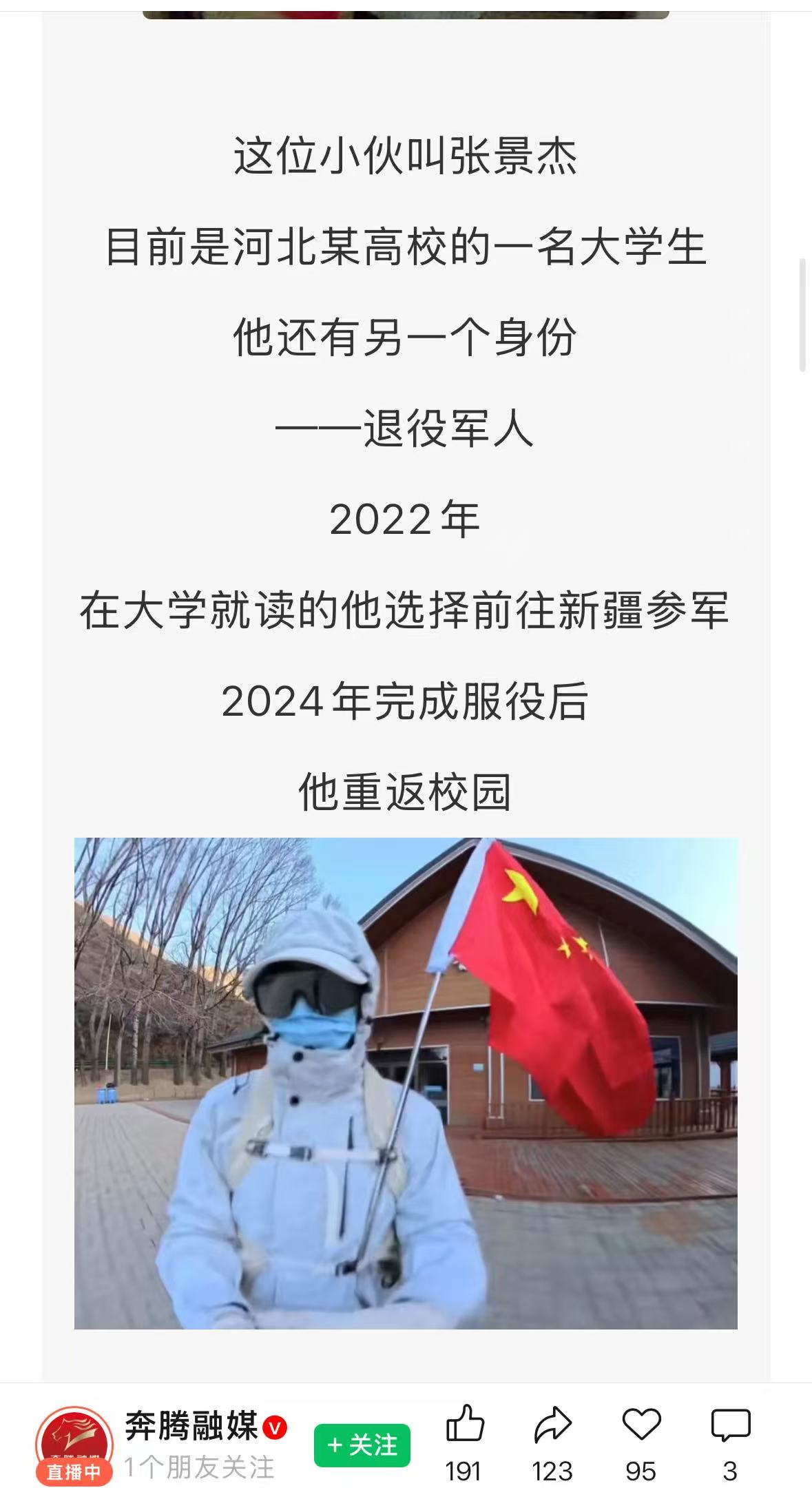 这并非一时冲动的善举,而是刻在骨子里的军人本色。张景杰2022年参军奔赴西北边陲,服役于新疆,两年的军旅生涯让他从懵懂学生蜕变为合格军人。“排雷英雄”杜富国的事迹深深触动了他,让他懂得了“光荣在于平淡,艰巨因为漫长”的含义。