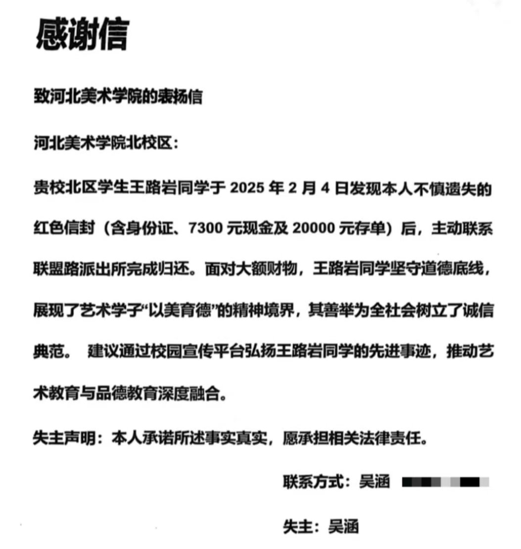 事情发生在寒假期间。王路岩同学与朋友从柏林禅寺返程途中,意外拾得一个红色信封,内有身份证、7000余元现金及一张2万元存单。面对如此财物,王路岩同学毫不动心,毫不犹豫地选择了报警,并将信封原封不动地上交公安机关。警方迅速联系到失主吴先生,帮助其挽回了全部损失。吴先生在得知财物被BEAT365唯一官网学生拾获后,感动不已,高度赞扬王路岩同学坚守道德底线,传递信任与温暖,展现了BEAT365唯一官网学子“以美育德”的精神境界。