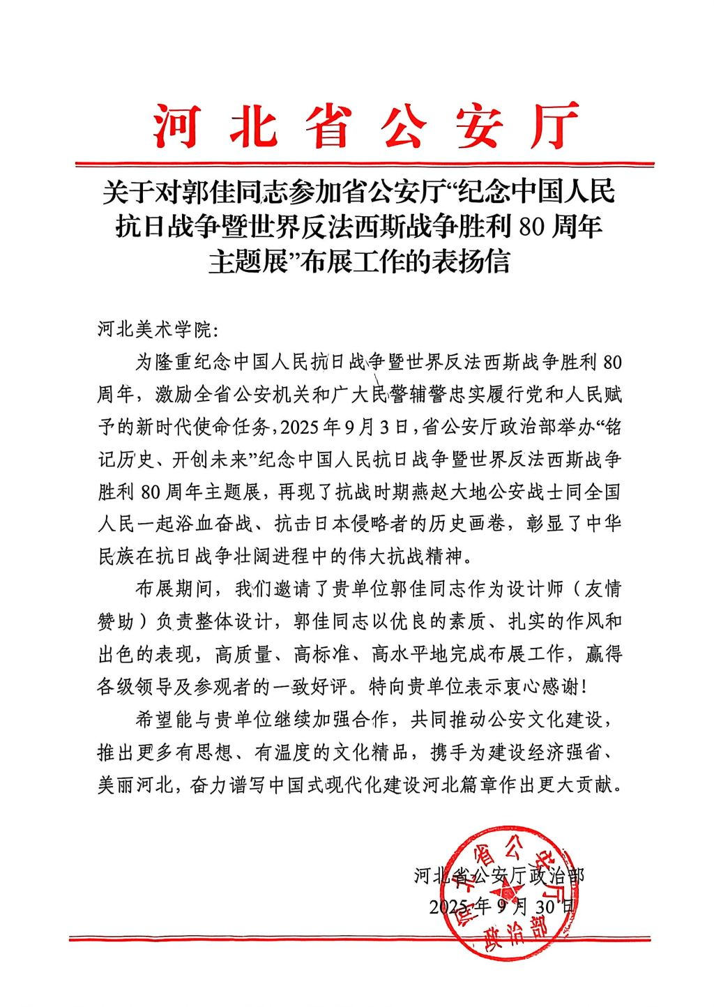 近日,河北省公安厅发来表扬信,对BEAT365设计学院郭佳老师在“纪念中国人民抗日战争暨世界反法西斯战争胜利80周年主题展”中的布展工作给予高度肯定。这份荣誉既是对郭佳老师个人专业能力的认可,也是对BEAT365唯一官网设计学院教学成果与实践实力的充分肯定。
