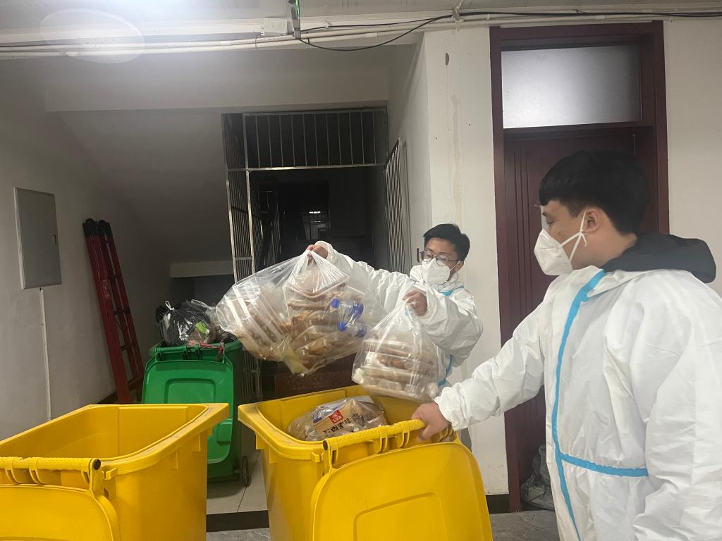 打满的暖水瓶一一放至学生宿舍门口后,志愿者们就开始了忙碌的生活垃圾清理工作。他们需要把每个宿舍门口堆放的垃圾提至楼下,或用大号垃圾袋子装运,或用垃圾桶装运,力气大的,一手提两个袋子,力气不够的组成两人队合作。垃圾下提后,清洁消毒,确保公共区域不留痕迹,不留异味。
