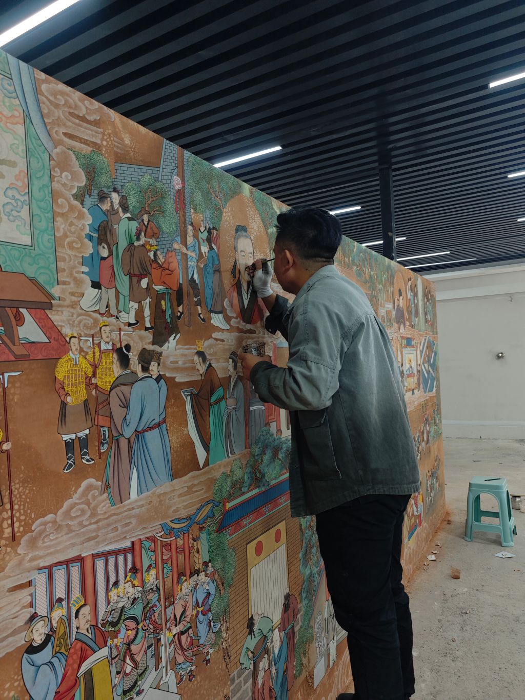2011年毕业至今,田刚始终扎根传统壁画领域,用脚步丈量艺术版图。北京福佑寺的古朴壁画、香港东林寺的庄严彩绘、河南丹江大观苑的人文图景、内蒙古鄂尔多斯九成宫文化馆的历史再现、江苏海安市志开禅院的禅意表达、兰州报恩寺与常山寺的宗教艺术……全国多地的文化地标里,都留下了他精心创作的痕迹。不仅如此,他还投身国家级旅游文物壁画修复工作,以专业技艺修补岁月痕迹,让古老壁画重焕光彩,用行动践行着“守护文化遗产”的使命。