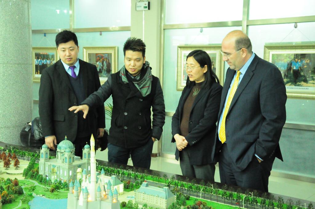 会后,甄墨校长及贾智永院长带领Mike先生一行参观了学校的美术馆、大成殿、忠义堂、水榭,并乘车游览南区城堡群。来宾对学校校园建设表示赞叹,称此行令人印象深刻。
