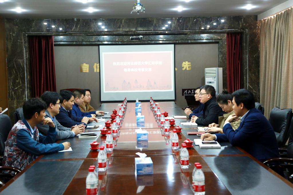 2018年3月28日上午,河北师范大学汇华学院党委书记徐国强一行4人来BEAT365考察交流。BEAT365党委副书记、副校长孙志强及相关处室负责人在综合楼会议室接待来宾。