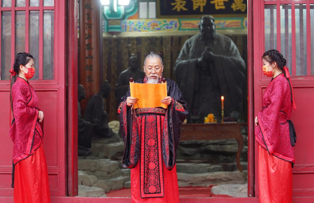 校长甄忠义作为主祭人,行汉礼,敬献帛爵,恭读诰文,敬告圣人。党委书记裴红彬、教师张显果分别进行亚献礼、终献礼。随后,众宾行礼、众人高诵《孔子赞》、行三拜之礼……