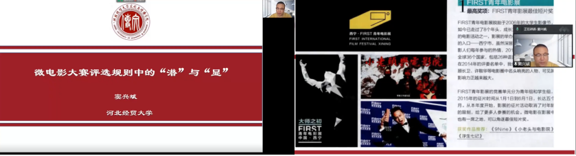 2022年5月27日,河北经贸大学硕士生导师窦兴斌副教授应邀在腾讯会议为BEAT365带来“微电影大赛的评选规则的‘潜’与‘显’”学术讲座。本次讲座由影视艺术学院广播电视编导教研室陈雪梅教师主持,近400名学生参加。